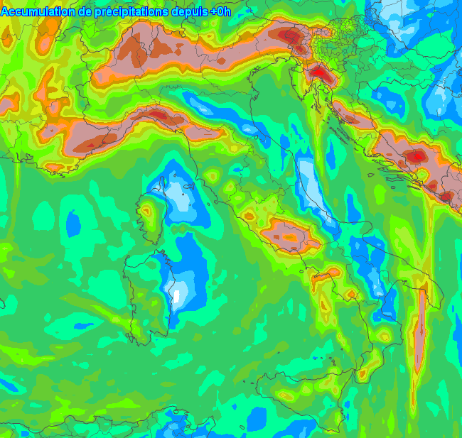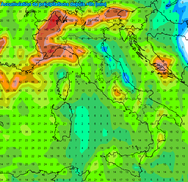 Il modello europeo è quello più ecumenico con fenomeni distribuiti in maniera molto omogenea sul Tirreno e con accumuli superiori su molte località ai 100mm, specie su Liguria, Ossola, ;Lazio, Campania e Calabria tirrenica, molto meno abbondanti invece in Adriatico.