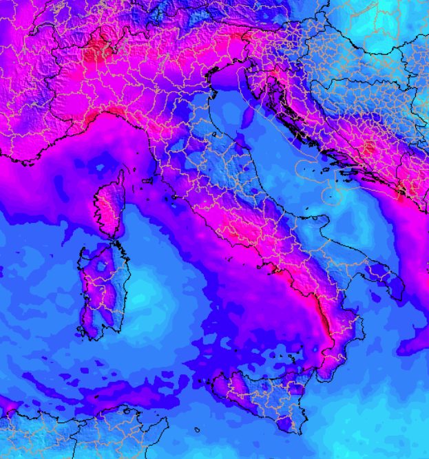 Ne deriverebbero così precipitazioni rilevanti su fascia alpina, tranne l’Alto Adige, la Liguria, il basso Lazio, la Campania e soprattutto appare interessante la “strisciata” temporalesca a ridosso del Salento.