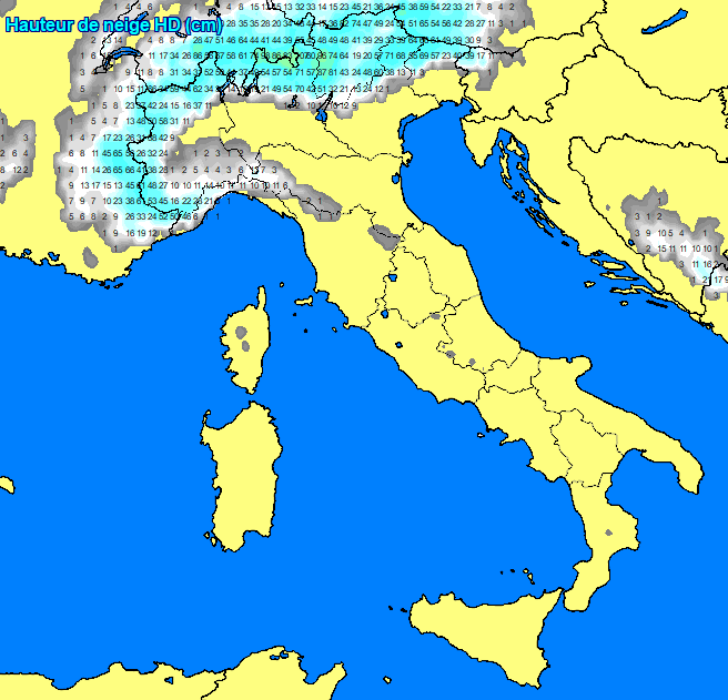 La mappa delle precipitazioni nevose accumulate sino al 27 febbraio secondo il modello americano, nel momento di massima estensione delle copertura anche alla pianura piemontese e ai fondovalle alpini, da notare anche la neve a quote bassissime sull’Appennino ligure: