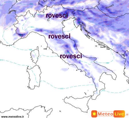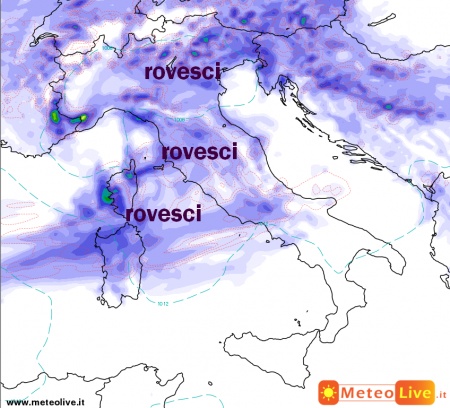EVOLUZIONE: giovedì tempo simile con rinnovo dell’instabilità sulle zone interne e sul Triveneto, mentre per venerdì ci attendiamo l’avvicinamento di un’altra perturbazione che determinerà rovesci e brevi temporali al nord, sulla Sardegna e sulle regioni centrali tirreniche nel pomeriggio-sera, come vediamo in questa mappa: