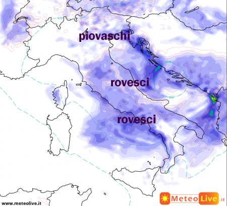 SITUAZIONE: una perturbazione ha attraversato ieri l’Italia e si sta portando sull’est europeo ma seguita a produrre dell’instabilità atmosferica su parte del Triveneto. Al suo seguito sta affluendo aria più fresca che genererà focolai temporaleschi sulle zone interne del centro e del sud, come si vede nella mappa qui sotto: