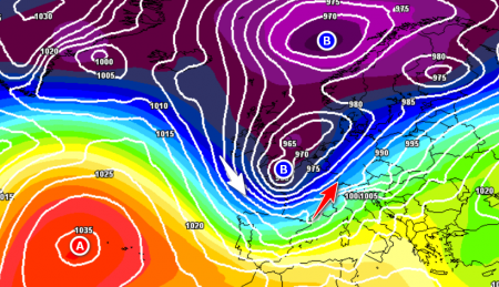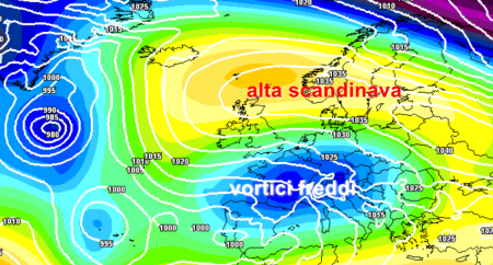 Ecco un’altra analisi barica a supporto a 5500m e al suolo proprio per lo stesso giorno (EPIFANIA), che evidenzia la formazione di un anticiclone scandinavo e un flusso retrogrado freddo da est sull’Italia: