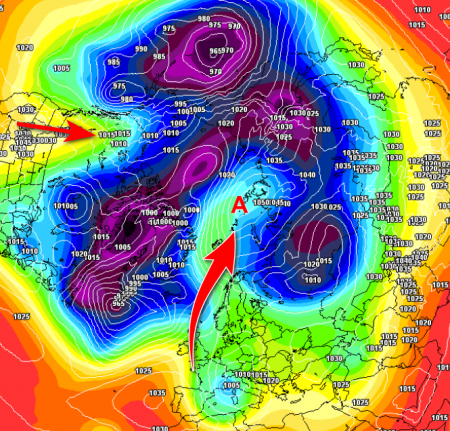 Volete vedere da un’altra corsa come verrebbe attaccato il vortice polare troposferico? Ecco qui una mappa di tutto l’emisfero nord sempre per l’Epifania, si nota molto bene l’intrusione dell’aria mite sin sul Polo con conseguenze che vi lasciamo immaginare: l’aria fredda si mette in moto verso sud: