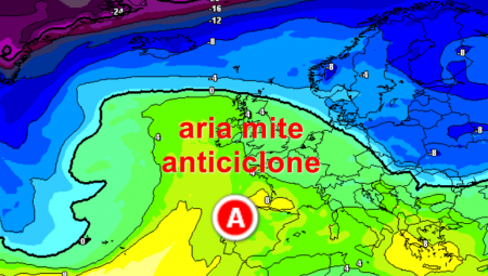Non è un anticiclone molto forte, ma c’è e assicura il solito clima ben poco invernale, giusto uggioso nelle solite zone (coste dell’alto Tirreno, Liguria, Valpadana).