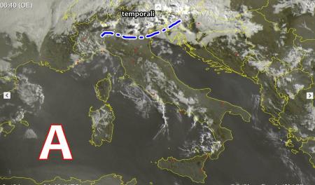 Rovesci e temporali sparsi, molto più irregolari, sul Nordovest, Marche, Abruzzo e zone interne della Toscana. Più stabile altrove con caldo nella norma.