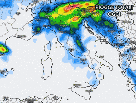 La giornata odierna si rivelerà molto instabile al nord, parzialmente anche al centro Italia. Gli accumuli più importanti sono previsti su Veneto, Lombardia, Trentino alto Adige, Friuli Venezia Giulia. Nelle aree evidenziare in arancione potrebbero precipitare, sino alle prime ore della notte di martedì, fino a 60-70 mm di pioggia. Questi temporali, più presenti tra pomeriggio e sera, potrebbero rivelarsi molto forti e dar vita anche a grandinate isolate.