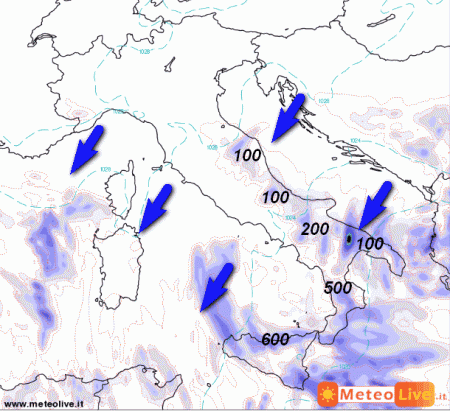 La prima mappa mostra la sommatoria delle precipitazioni attese oggi in Italia: