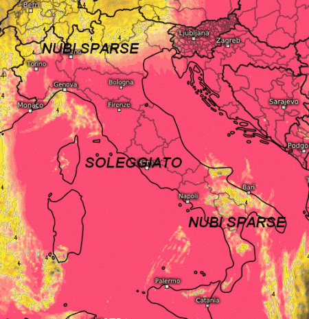 Nubi sparse tra le alte pianure e le Alpi senza piogge. Residui addensamenti anche al sud, ma senza fenomeni, per il resto soleggiato. Attenuazione del vento e temperature in aumento.