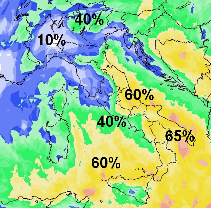 Solo il versante centrale tirrenico, la Sardegna e il nord-ovest rimarrebbero sottovento a questa circolazione depressionaria e dunque in cielo sereno. Le temperature con questo flusso settentrionale non riuscirebbero più a riportarsi su valori prettamente estivi.