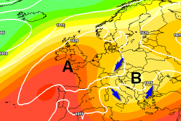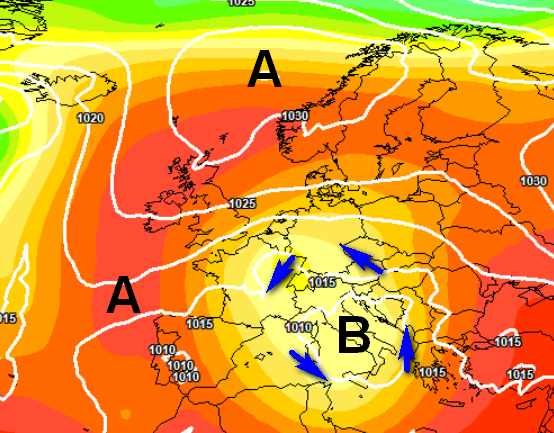 Infatti al momento diversi modelli segnalano la possibilità concreta che il tempo rimanga condizionato almeno in parte da una circolazione depressionaria che andrà a posizionarsi sui Balcani, coinvolgendo anche le nostre regioni adriatiche e meridionali, e mantenendo attivo un flusso settentrionale instabile che favorirà manifestazioni temporalesche e rovesci di pioggia a carattere sparso, come si vede da questa mappa barica prevista per lunedì 16 settembre: