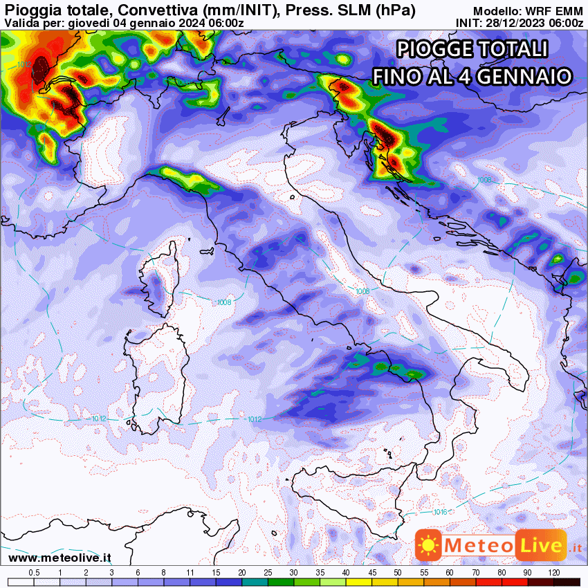 Lunedì 1 gennaio: Capodanno con tante nubi specie sul lato tirrenico. Piogge sparse dalla Liguria orientale alla Campania, pioviggini sparse sul Triveneto. Asciutto altrove.
