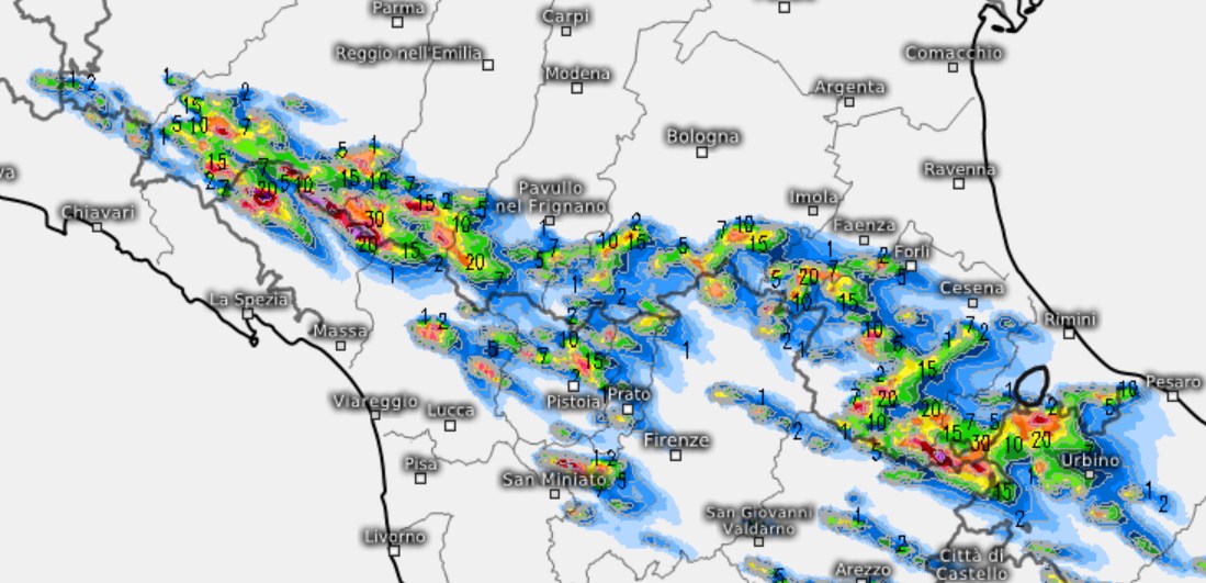 Attenzione soprattutto sull’Appennino tosco-emiliano nel pomeriggio, ecco il dettaglio ad altissima risoluzione: