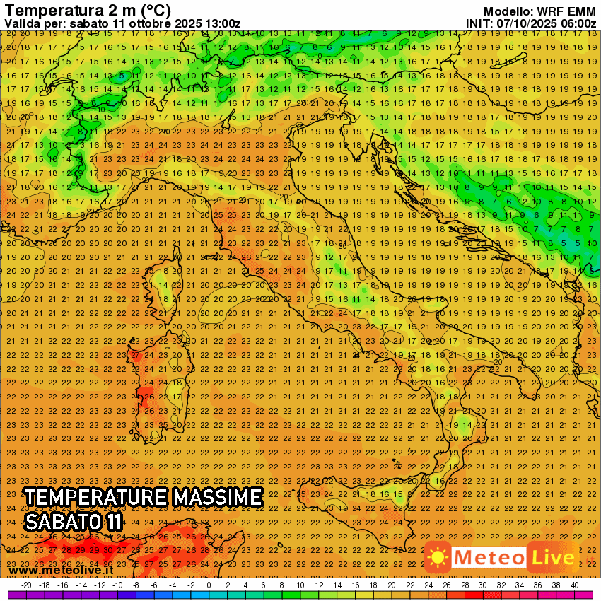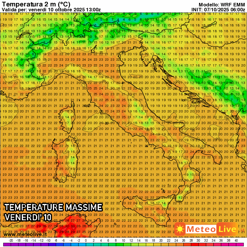 Nel corso di venerdì 10 ottobre si prevedono massime fino a 24-25°C nelle zone interne di Toscana, Liguria e Lazio, ma anche in Val Padana il clima sarà piuttosto mite, con punte di 24°C. Situazione simile anche in Sardegna, mentre sul resto d’Italia le temperature risulteranno un po’ più basse, ma pur sempre in un contesto stabile e con poco vento. Qualche picco isolato di 24°C sarà possibile su arco ionico e Sicilia.