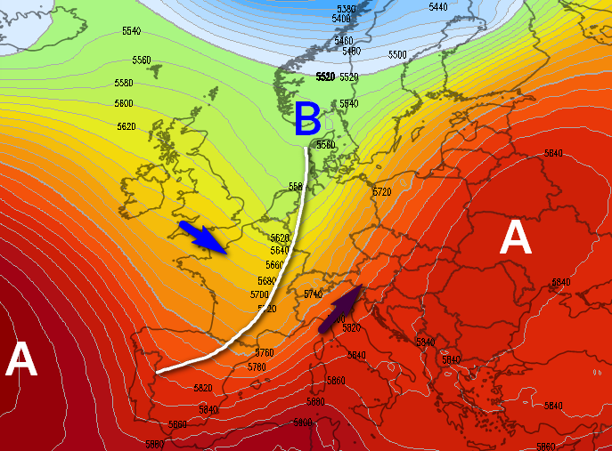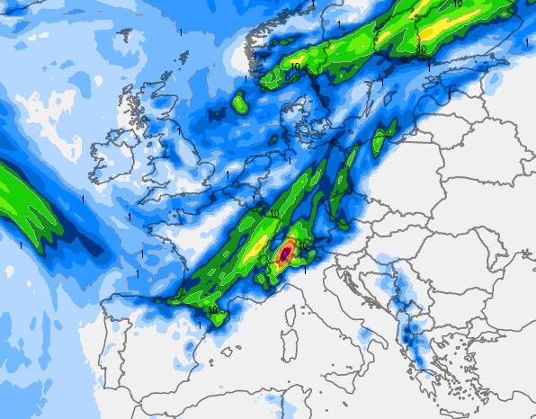 Ed ecco la mappa delle precipitazioni, dalla quale si deduce la presenza del fronte freddo sulla verticale della Francia e a ridosso ormai delle Alpi, in procinto di sfondare sul nostro settentrione entro la serata del 20 agosto: