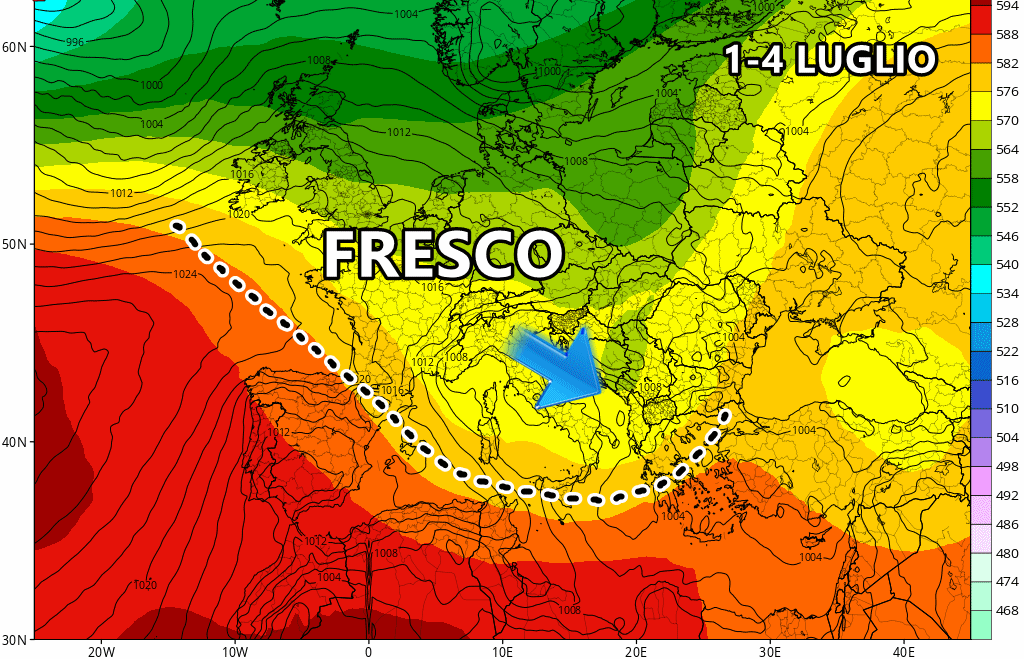 L’instabilità prenderà il sopravvento tra domenica e lunedì su gran parte del Nord, mentre il Sud vivrà attimi di grande caldo fino alla serata di lunedì. Le carte in tavola cambieranno radicalmente tra il 2 e il 4 luglio, quando una massa d’aria molto fresca proveniente dal Nord Atlantico spazzolerà via l’afa subtropicale e riporterà temperature decisamente più gradevoli. Il calo termico non passerà inosservato e potremmo imbatterci in acquazzoni e violenti temporali non solo al Nord ma anche sulle regioni centrali e quelle adriatiche.