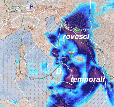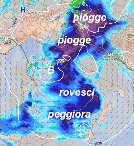 FINE SETTIMANA: la depressione a ridosso della Sardegna si sposterà verso il basso Tirreno portando maltempo su isole, Campania, Lazio, Abruzzo, e successivamente sulle restanti regioni meridionali, tempo buono ma più freddo sul resto del Paese.