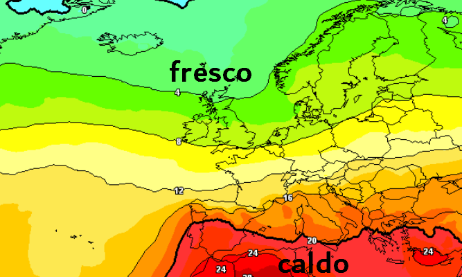 Da notare che questo parziale sfondamento dell’Atlantico ridimensionerà ovunque le temperature, anche laddove non interverranno precipitazioni, come possiamo vedere da questa mappa termica a 1500m: