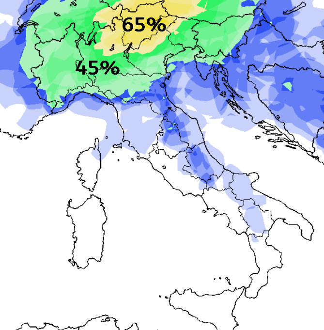 La maggiore possibilità di precipitazioni superiori ai 5mm proprio intorno al periodo 6-7 luglio (ma probabilmente anche prima di tale data) si scorge sul Trentino Alto Adige e sul Cadore, ma una discreta possibilità il modello la vede anche sul resto del nord e più marginalmente anche lungo la dorsale appenninica del centro e lungo il medio Adriatico: