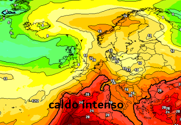Ecco la massa d’aria calda così come si prevede martedì 15 luglio a 1500m in avanzata dal nord Africa verso l’Italia: