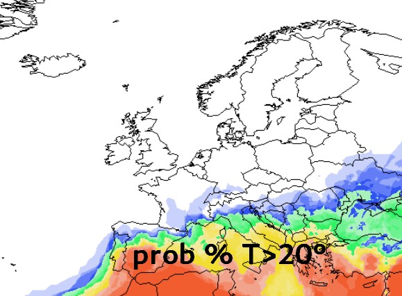 Quanto esposto si nota ancora meglio dalla carta probabilità che evidenzia con una scala di colori se potranno raggiungersi valori superiori ai 20°C a 1500m. In rosso la più alta probabilità, in marroncino e giallino una probabilità moderata, in verde e in azzurro quella minore, in bianco praticamente nulla. Come vedete al nord sarà difficile che il caldo riesca a sfondare in maniera estrema, mentre sul resto d’Italia questo sarà possibile, ma in modo meno opprimente rispetto a giugno:
