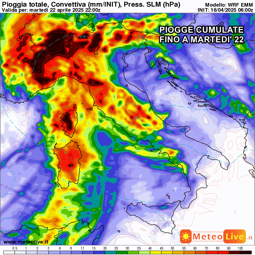 Eloquenti le piogge previste nei prossimi sette giorni. Accumuli importanti al nord, specie su Piemonte, Liguria, Valle d’Aosta e Lombardia dove si prevedono picchi di 300 mm a ridosso dei monti. Tanta pioggia anche al centro, mentre pioverà davvero molto poco al sud, eccetto qualche veloce temporale giovedì ed un po’ di piogge marginali nel corso di Pasquetta.