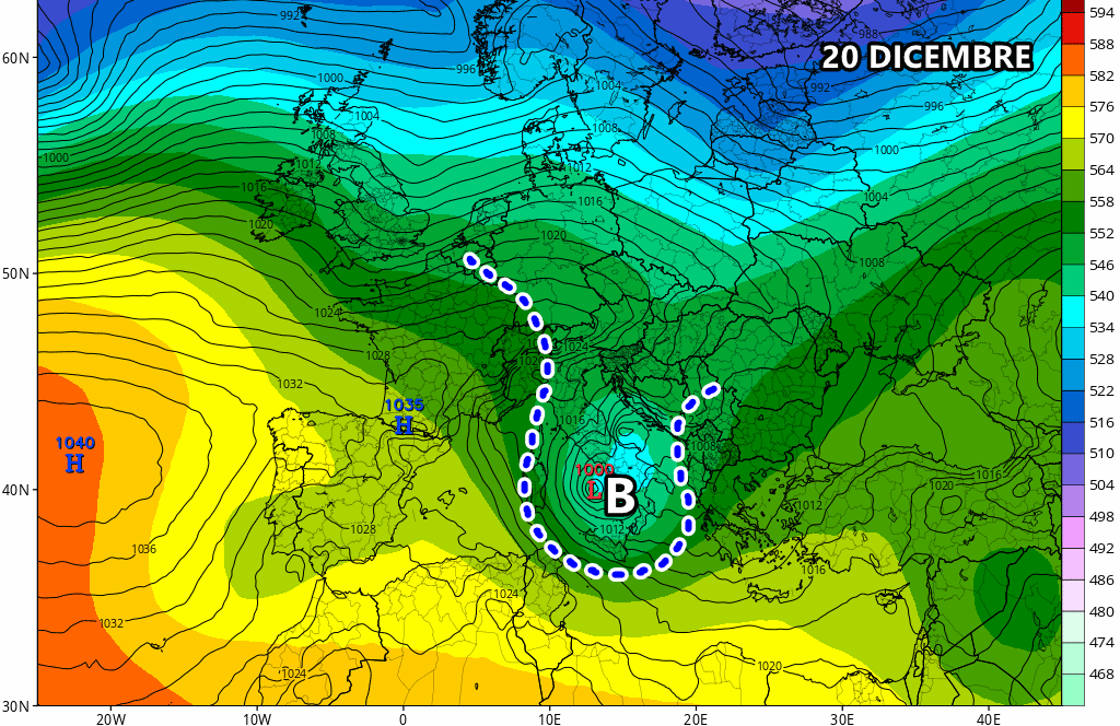 Venerdì 20 Dicembre: ciclone in rapido spostamento verso sud. Maltempo diffuso al centro Italia con forti nevicate entro sera fino a 800 metri. Forti venti di burrasca sul medio-basso Tirreno. Temperature in calo.