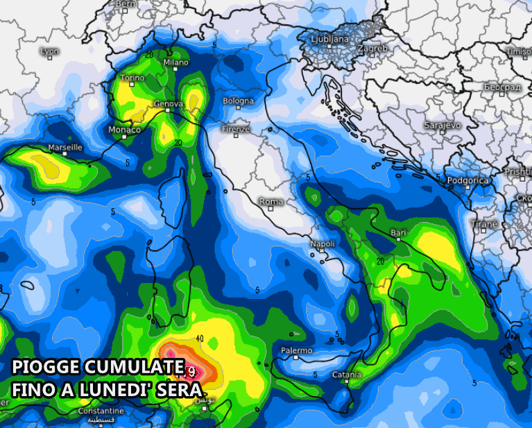 Ancora piogge attese a inizio settimana sulle regioni del Sud, in particolar modo tra Puglia, Basilicata e Calabria ionica. Non escludiamo una recrudescenza dei fenomeni anche nella giornata di martedì, soprattutto sulle aree interne del Sud Italia, poiché questo ciclone resterà confinato all’interno del Mediterraneo per qualche giorno di troppo.