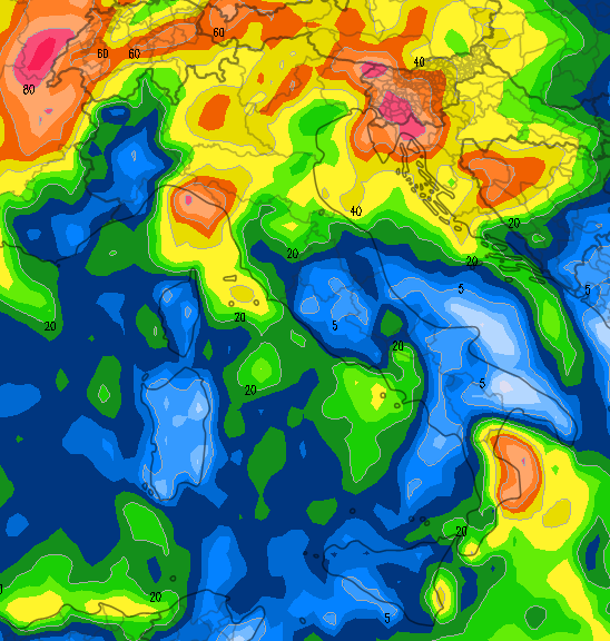 Come si nota le precipitazioni più abbondanti andranno a concentrarsi soprattutto su Liguria, Lombardia, regioni di nord-est ed Emilia-Romagna, ma non risparmieranno il versante tirrenico sino alla Campania, mentre risulteranno meno importanti lungo l’Adriatico, in Sardegna, sul basso Piemonte e parte della Sicilia. Attenzione: gli accumuli sulla Calabria jonica sono quasi tutti legati alle situazioni temporalesche residue del 1° novembre.