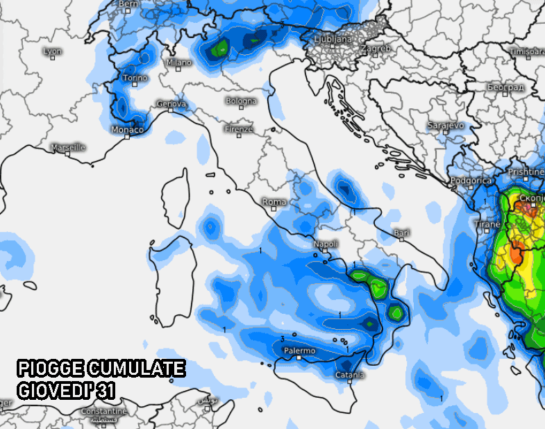 Il modello americano GFS mostra un po’ di precipitazioni in arrivo giovedì, proprio sul finire del mese di luglio, prettamente al Sud. Sicilia settentrionale, Calabria, Basilicata e Cilento sarebbero i settori più interessati da piovaschi e locali temporali. Insomma, tempo “pazzerello” e variabile da mattina a sera. Qualche scroscio veloce di pioggia potrebbe interessare anche Puglia, Molise, Lazio, Abruzzo e settori alpini/prealpini.