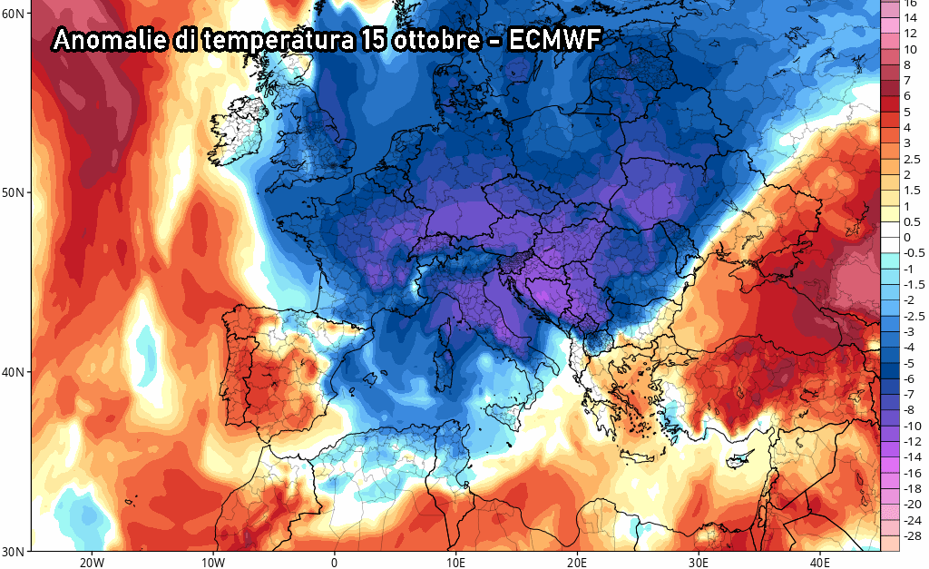 Il modello europeo ECMWF indica l’arrivo di aria particolarmente fredda nel Mediterraneo già dal 15 ottobre, cioè a metà prossima settimana. La colonnina di mercurio potrebbe perdere fino a 10-12°C rispetto alle medie tipiche del periodo, specie al Centro-Nord: parliamo di temperature più consone al mese di dicembre che non ad ottobre.