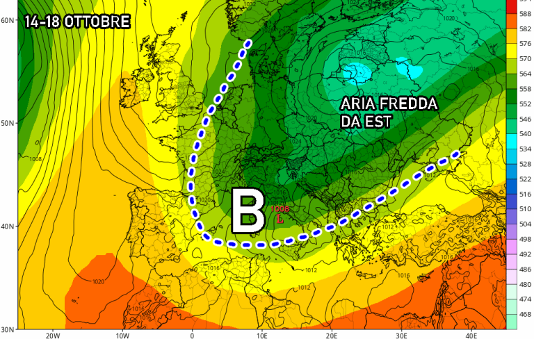L’alta pressione, infatti, tenderà ad allontanarsi lentamente dall’Italia per dirigersi verso Francia, Gran Bretagna e Mar Baltico, dove si rafforzerà nettamente nell’arco di pochi giorni. Questo rigonfiamento dell’anticiclone sul Nord Europa favorirà il distacco di una massa d’aria fredda dalla Russia, pronta a raggiungere il Mediterraneo centrale nel periodo compreso tra il 14 e il 18 ottobre.