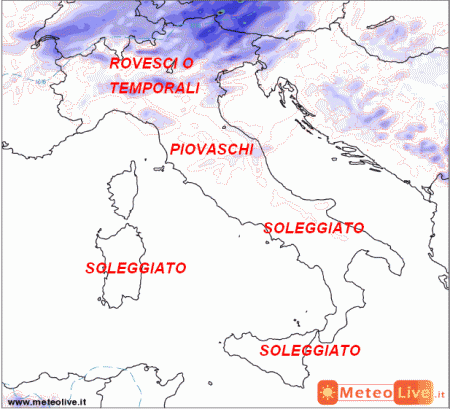Ecco i rovesci con qualche temporale che tenderanno ad intensificarsi nel pomeriggio sulle regioni settentrionali, segnatamente tra la Lombardia e il nord-est dove si prevedono anche occasionali grandinate.