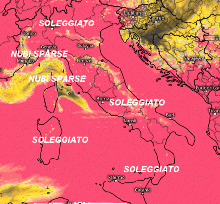Un po’ di nubi sparse tra il Piemonte occidentale, il Mar Ligure e la Corsica senza piogge. Su tutte le altre regioni tempo stabile e soleggiato a parte nubi sui rilievi nel pomeriggio senza fenomeni. Temperature in aumento nei valori massimi.
