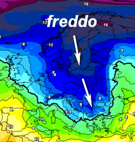 Tempo instabile al centro e al sud per l’inserimento di una corrente settentrionale progressivamente più fredda, che lascerà sottovento e dunque in cielo sereno il settentrione. Martedì questo freddo entrerà in maniera più netta lungo il versante adriatico, determinando anche brevi nevicate lungo la dorsale appenninica di Marche, Abruzzo e Molise, per poi riversarsi addirittura sino alla Grecia entro le prime ore di mercoledì. Qui le temperature previste a 1500m dal modello americano all’alba di martedì: