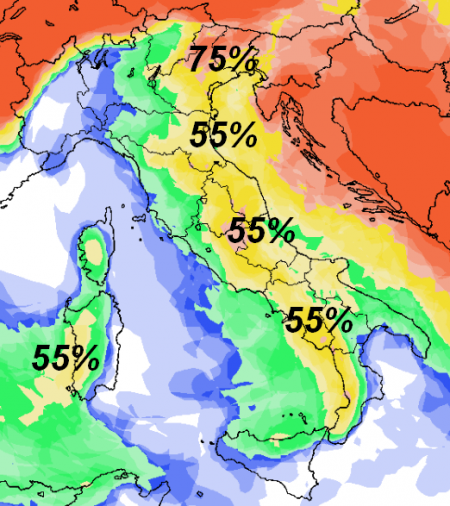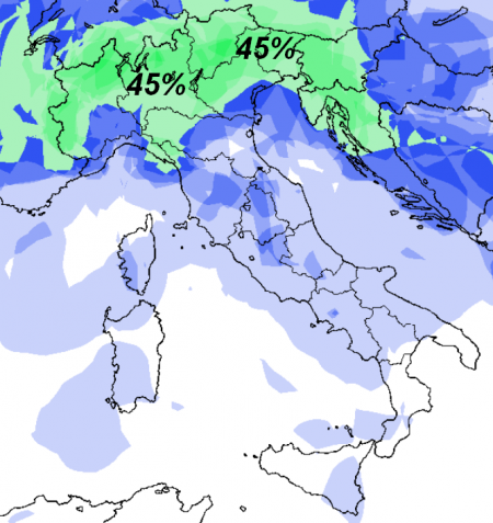 E per finire ecco la mappa relativa al rischio di pioggia espressa in percentuale con una scala di colori che mette il nord in pole position per sabato 8 e domenica 9 aprile, pur con percentuali non altissime, ma stiamo parlando di una previsione davvero a lunga gittata, per la quale sarà necessario aggiornarsi: