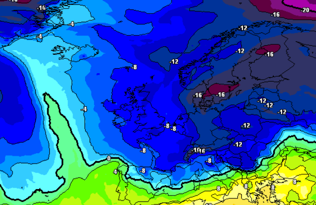 Qui però siamo già avanti, cominciamo a sciogliere il nodo di metà mese, che è tornato in discussione. Se passasse l’ipotesi fredda per il Mediterraneo, ecco le termiche previste a 1500m, con l’aria gelida in viaggio verso sud: