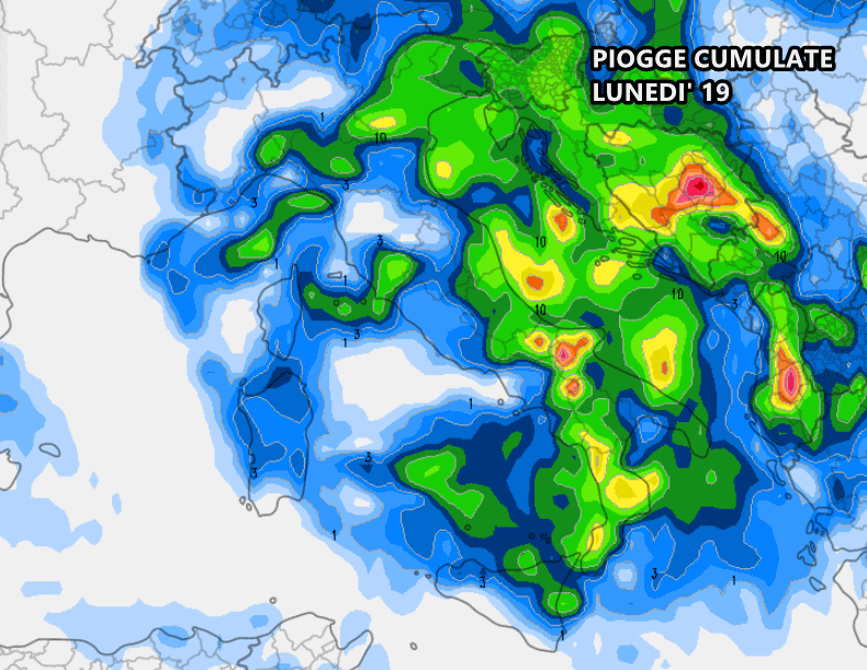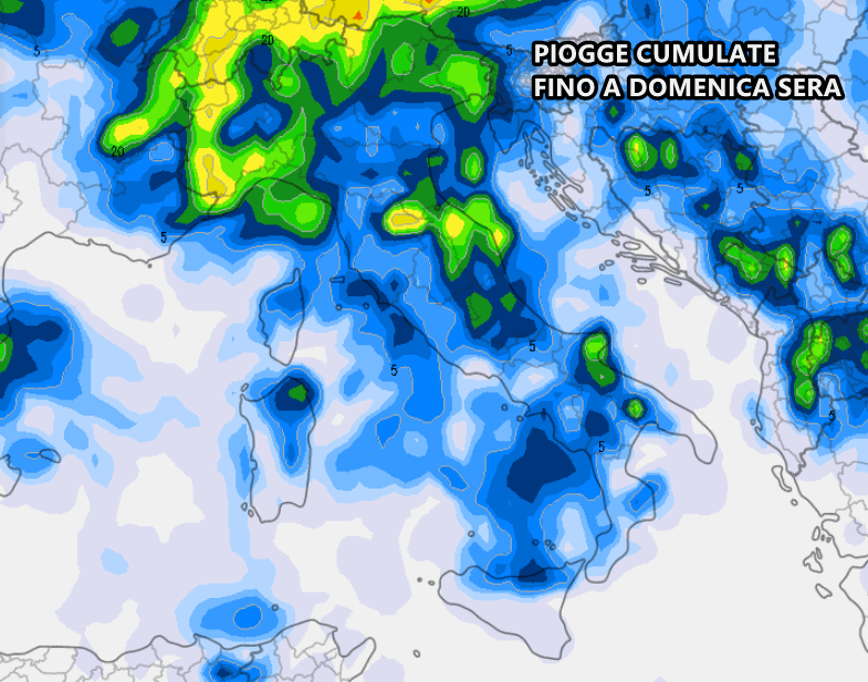 Da qui fino al termine della settimana si prevedono accumuli di pioggia più sostanziosi al Nordovest, arco alpino, Marche ed entroterra toscano. Tuttavia si tratta di stime molto indicative, considerando che in presenza di forti temporali (cosa molto probabile specie al centro Italia) gli accumuli potrebbero essere nettamente superiori rispetto a quelli previsti.