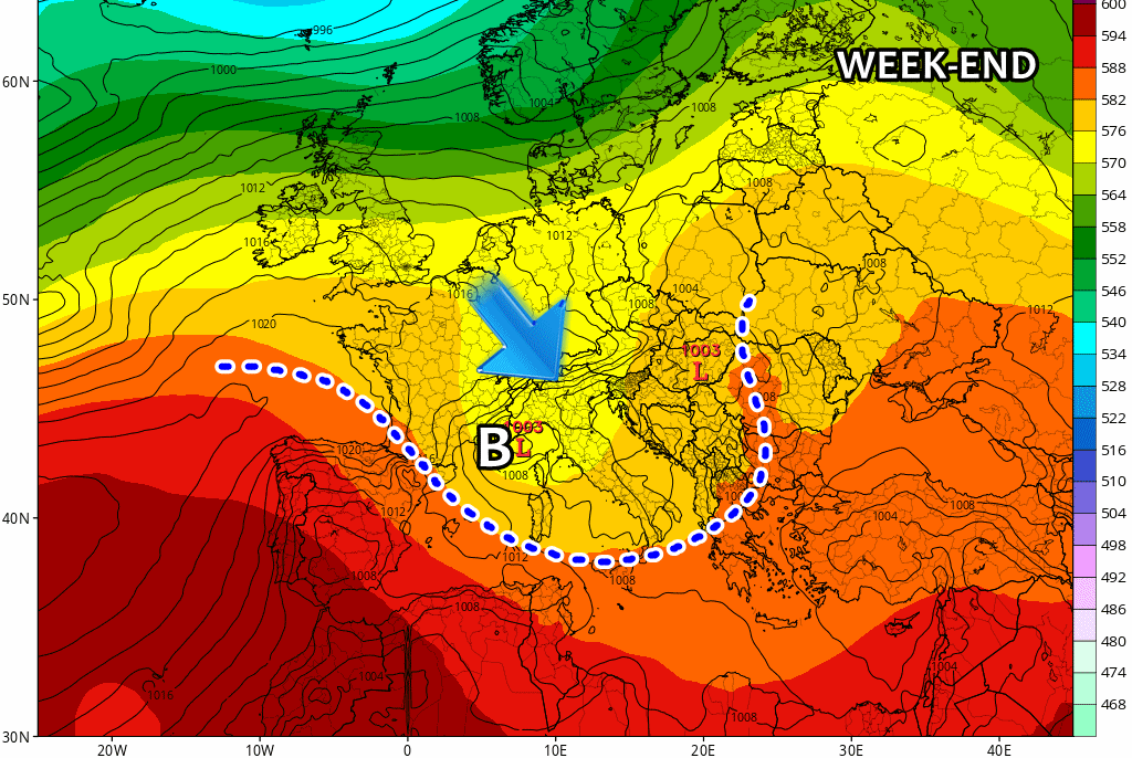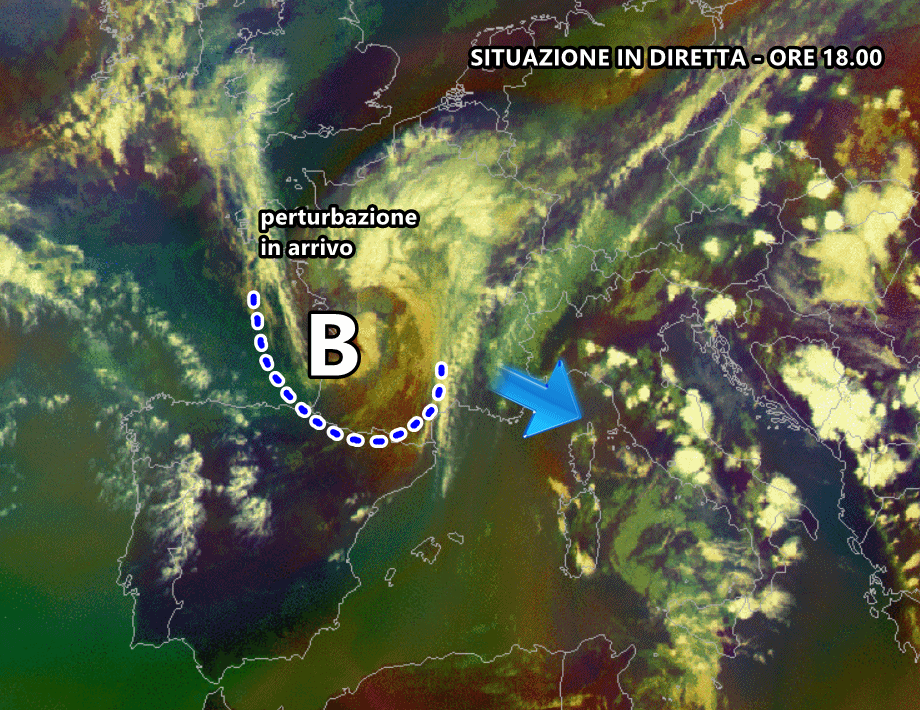 Si avvicina a grandi falcate la perturbazione che avrà il grande merito di spazzar via la calura africana dall’Italia per alcuni giorni. Il centro di bassa pressione è ora posizionato sulla Francia ma a breve la massa d’aria fresca raggiungerà il Mediterraneo dove comporterà un sensibile peggioramento.
