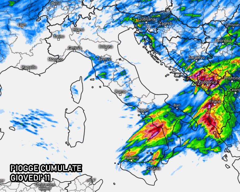 Come si evince dai modelli a scala locale, si prevedono precipitazioni abbastanza corpose per il meridione, tutte derivanti dal passaggio del fronte freddo che, oltre a forti acquazzoni, temporali e locali grandinate, porterà anche un sostanzioso calo delle temperature. Giovedì, infatti, la colonnina di mercurio precipiterà di oltre 7 o 8 °C, portandosi di qualche grado sotto le medie tipiche del periodo, dopo la veloce ondata di caldo in azione da 24 ore.