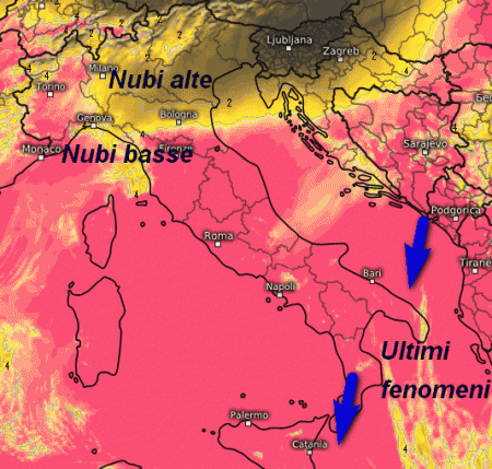Al primo mattino ultimi fenomeni all’estremo sud, in attenuazione. Nubi medio-alte al nord-est e basse sulla Liguria, per il resto soleggiato. Probabile assenza di nebbia sulle pianure del nord.