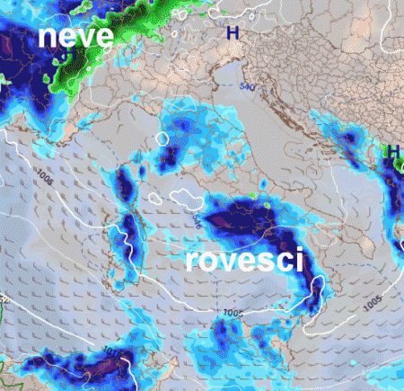Da notare oggi: i rovesci attesi sul Tirreno, specie sulla Campania, il basso Lazio e la Sardegna nel corso della giornata, cosi le nevicate sui settori alpini di confine valdostani, piemontesi e l’alta Valtellina con limite a 1000m.