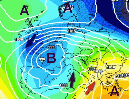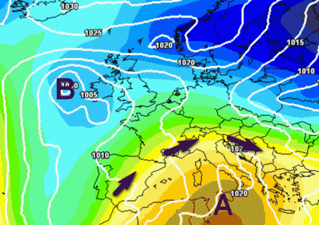 EVOLUZIONE: nel fine settimana da ovest riuscirà a sfondare un’area depressionaria che determinerà un peggioramento al nord e sul Tirreno, in estensione poi al resto del Paese, ma con fenomeni più insistenti al settentrione, dove sulle Alpi oltre gli 800-1000m tornerà la neve. Naturalmente lo sfondamento della depressione genererà anche un generale calo termico. Qui la sequenza: si nota il passaggio dalla parentesi anticiclonica al possibile maltempo del week-end: