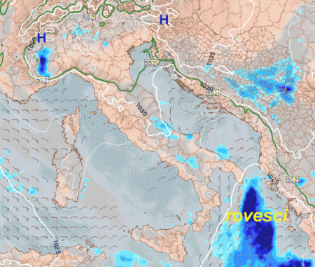 EVOLUZIONE: giovedì la depressione si isolerà sull’Iberia, mentre le correnti sulle nostre regioni si disporranno tra est e nord-est, facendo affluire ancora aria umida sul settore nord-occidentale, più instabile sul basso Adriatico e sullo Jonio, dove si prevedono locali rovesci, specie in mare aperto, come dimostra la mappa che segue, prevista per giovedì pomeriggio: