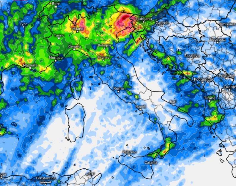 In ogni caso, questa previsione non è ancora del tutto certa. Infatti, il modello europeo ECMWF propone un inizio settimana ancora più estremo, con il Nord Italia assediato da piogge e temporali, mentre il Sud vedrebbe un tempo decisamente più asciutto (tranne locali acquazzoni e temporali tra Salento, Calabria e Sicilia), con ancora forti venti di Scirocco e temperature ben oltre la media stagionale.