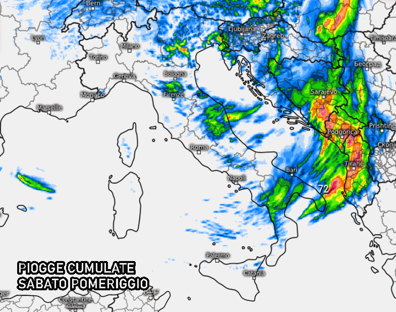 Nel corso della giornata avremo gli ultimi sussulti di questa perturbazione: indicativamente tra mezzogiorno ed il tardo pomeriggio avremo piogge residue in Puglia, Basilicata, cosentino, Cilento. Qualche forte temporale potrebbe svilupparsi sul Salento, nelle Marche e in Abruzzo, specie sui settori costieri.