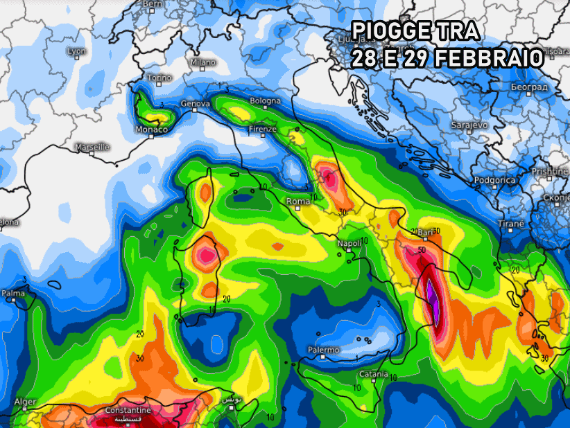 Tra 28 e 29 febbraio si prevedono piogge diffuse al centro e al sud, con rischio di locali nubifragi e temporali stazionari tra Calabria, Basilicata e Puglia. Oltre alla pioggia, il ciclone innescherà forti venti di scirocco su tutto il sud, con raffiche oltre 90 km/h.