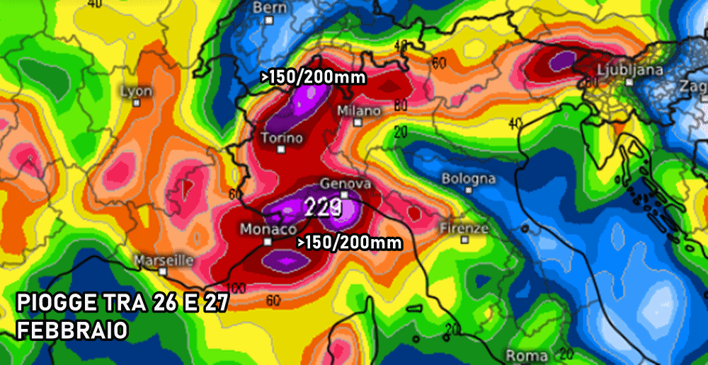 Solitamente in presenza di questi anticicloni di blocco assistiamo a piogge persistenti e temporali stazionari sul nordovest, specie in Liguria e Piemonte. Non a caso le previsioni relative agli accumuli di pioggia tra 26 e 27 febbraio mostrano picchi di oltre 200 mm su Piemonte e Liguria (in viola).