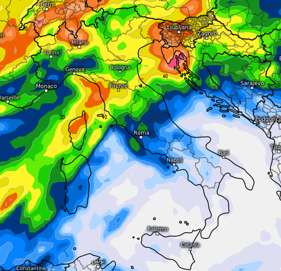Prendendo in esame la terza decade del mese vediamo la sommatoria delle precipitazioni previste dal modello GFS:
