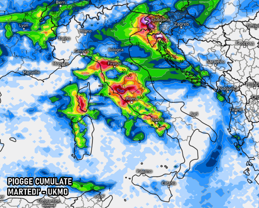 Precipitazioni molto più intense, invece, secondo il modello UKMO: non solo il Friuli Venezia Giulia, ma gran parte del Medio Tirreno potrebbe fare i conti con acquazzoni intensi e temporali semi stazionari, in grado di scatenare nubifragi per diverse ore consecutive. Ciò significa che su Toscana, Lazio e Friuli Venezia Giulia potrebbero accumularsi oltre 100 mm di pioggia in poco tempo, aumentando sensibilmente il rischio di allagamenti e altri disagi legati al maltempo.