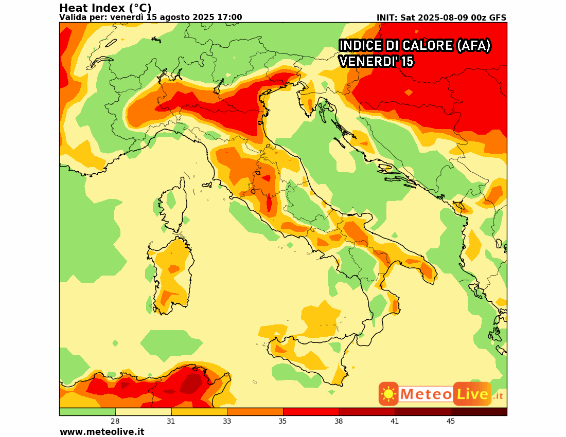 Eloquente l’indice di calore previsto per venerdì 15 agosto, con valori medio-alti di afa su tutta la Val Padana e valori medi sul resto d’Italia, evidenziati in colore arancione o giallo. Il gran caldo persisterà anche nelle ore serali, soprattutto al Nord e nelle città di mare.